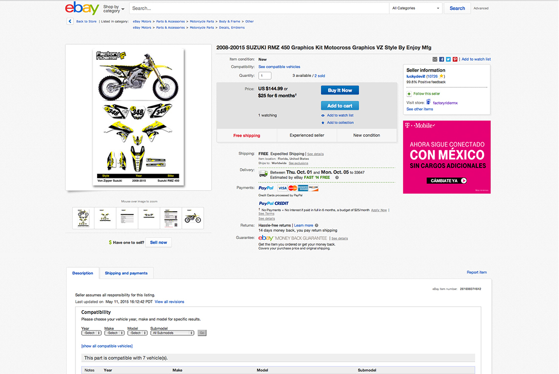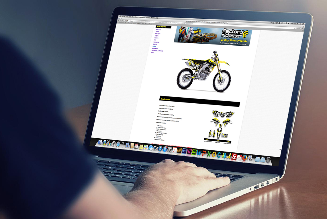 Process: The process begins with an exploratory research of the Factory Rider Ebay Store and it’s competitors. Factory Rider is an Ebay Store who sale products for dirt bikes, such as graphics and seat cover, among others. From the research I could identify some issues that they could be improve in order to increase those sales. The first issue was the no inclusion of the logo of the company in the store. The second issue found was the inconsistency between the product ads. Some listing ads show other kind of picture and information, and other listing ads show other picture and information. Finally, and the most important issue found and to solve, was the sales increase between all the products that my client offers.
